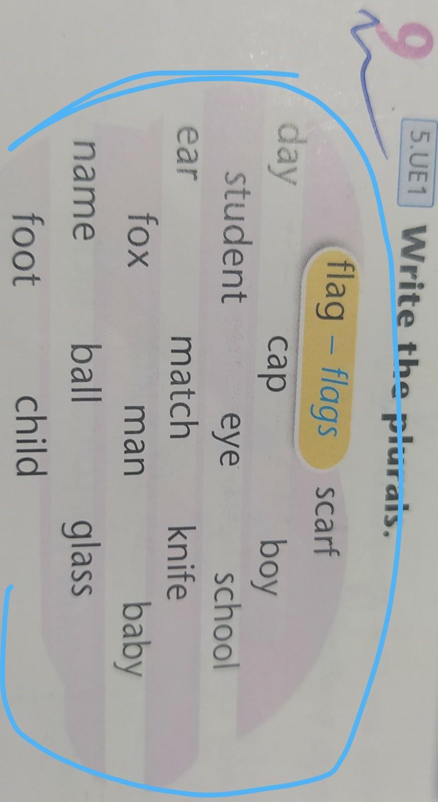 Scarfs, days, caps, boys, students, eyes, schools, ears, matches, knives, foxes, men, babies, names, balls, glasses, feet, children