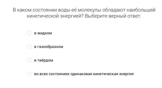 В каком состоянии воды её молекулы обладают наибольшей кинетической энергией? Выберите верный ответ.