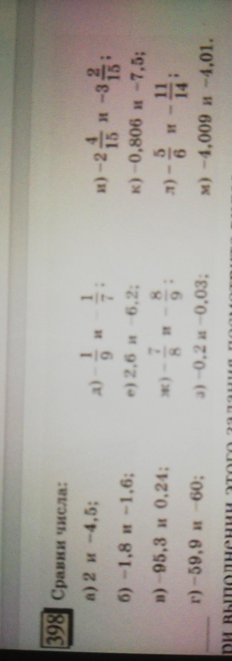 a) 2>-4,5. б) -1,8<-1,6. в) -95,3<0,24. г) -59,9>-60. д) -1/9>-1/7. е) 2,6>-6,2. ж) -7/8>-8/9. з) -0.2>-0.03. и) -2 4/15>-3 2/15. к) -0,806>-7,5. л) -5/6<-11/14. м) -4.009>-4.01