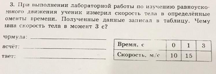 при выполнении лабораторной работы по изучению равноускоренного движения ученик измерил скорость тела в определенные моменты времени. полученные данные записал в таблицу. чему равна скорость тела в момент 3 с?