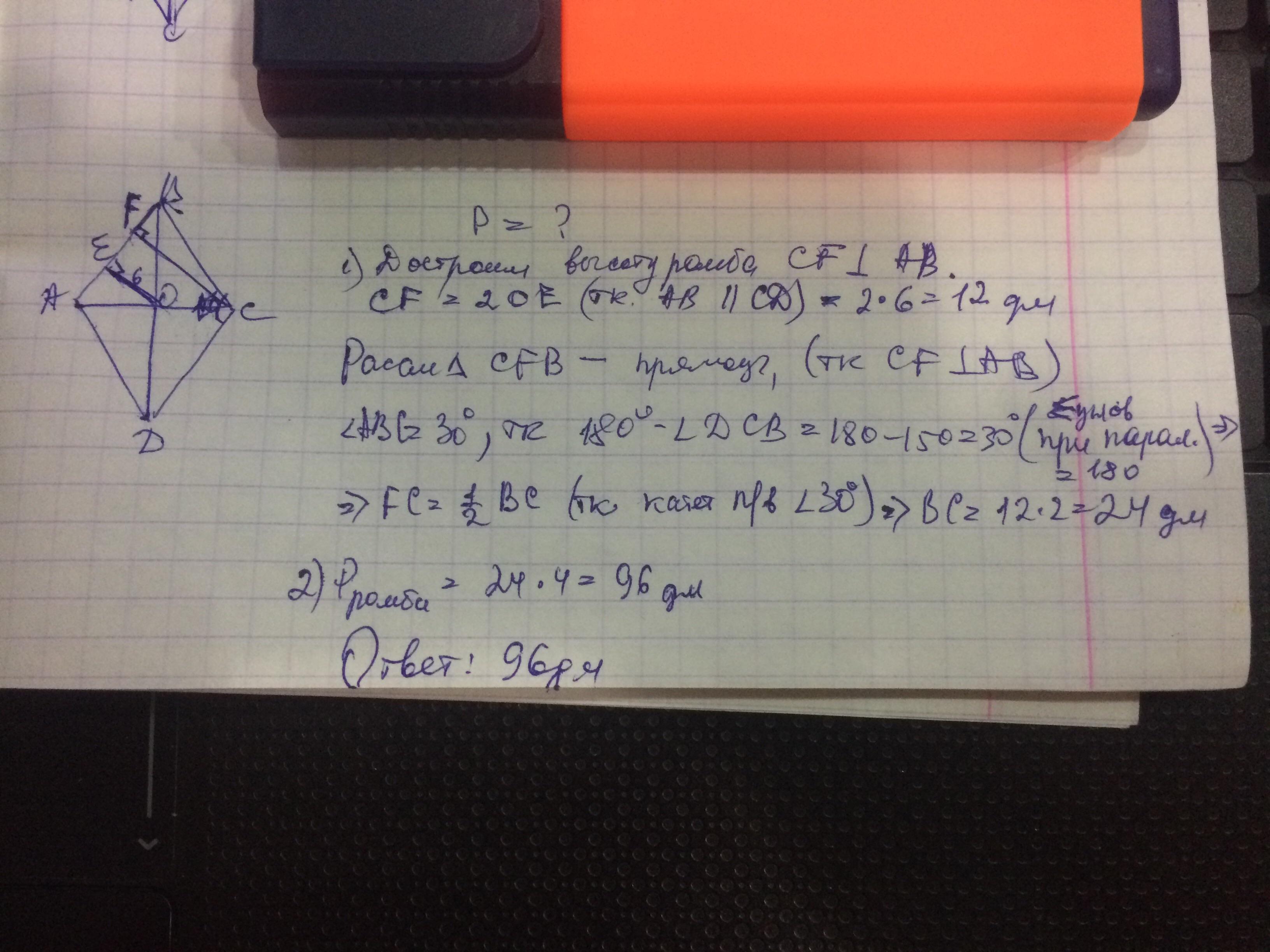 В ромбе с тупым углом 150 градусов расстояние от точки пересечения диагоналей до стороны равно 6 дм. Найти периметр ромба