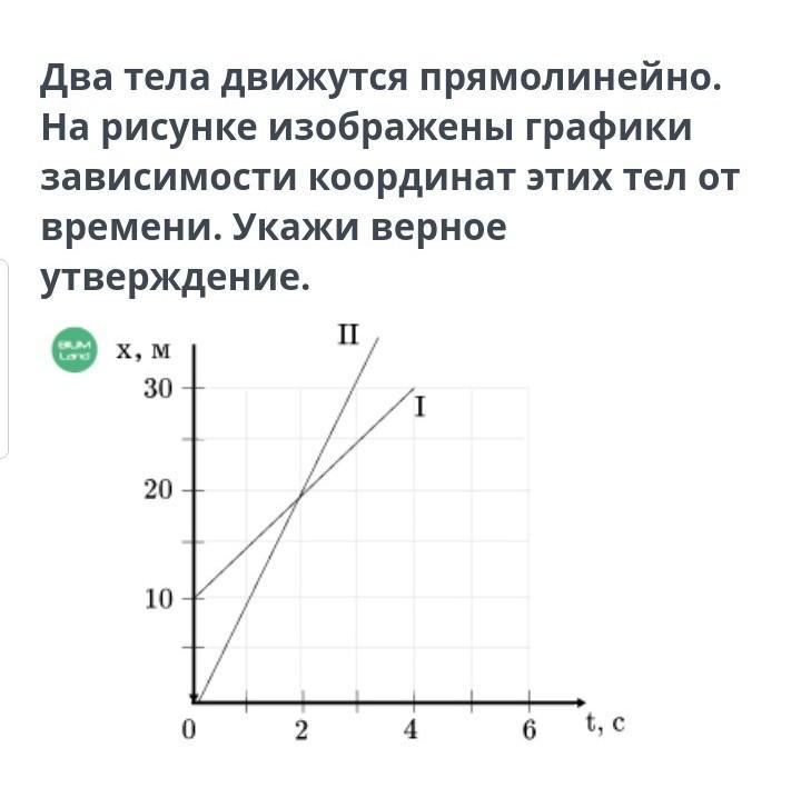 Два тела движутся прямолинейно. На рисунке изображены графики зависимости координат этих тел от времени. Укажи верное утверждение.