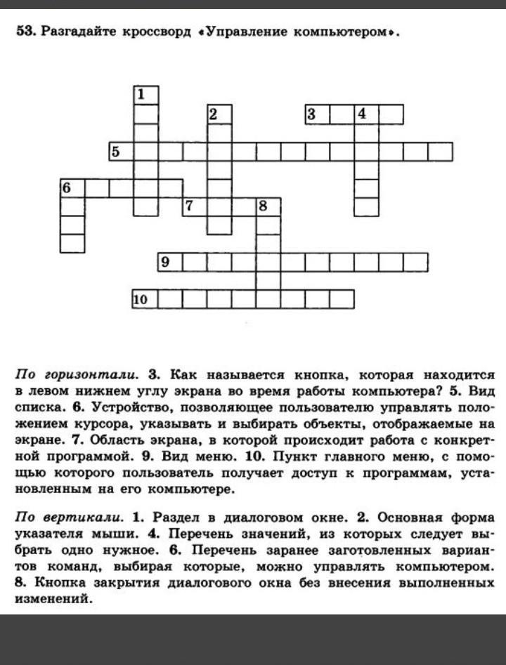 По горизонтали: 3. Пуск. 5. Раскрывающийся. 6. Мышка. 7. Окно. 9. Контекстное. 10. Программы.
