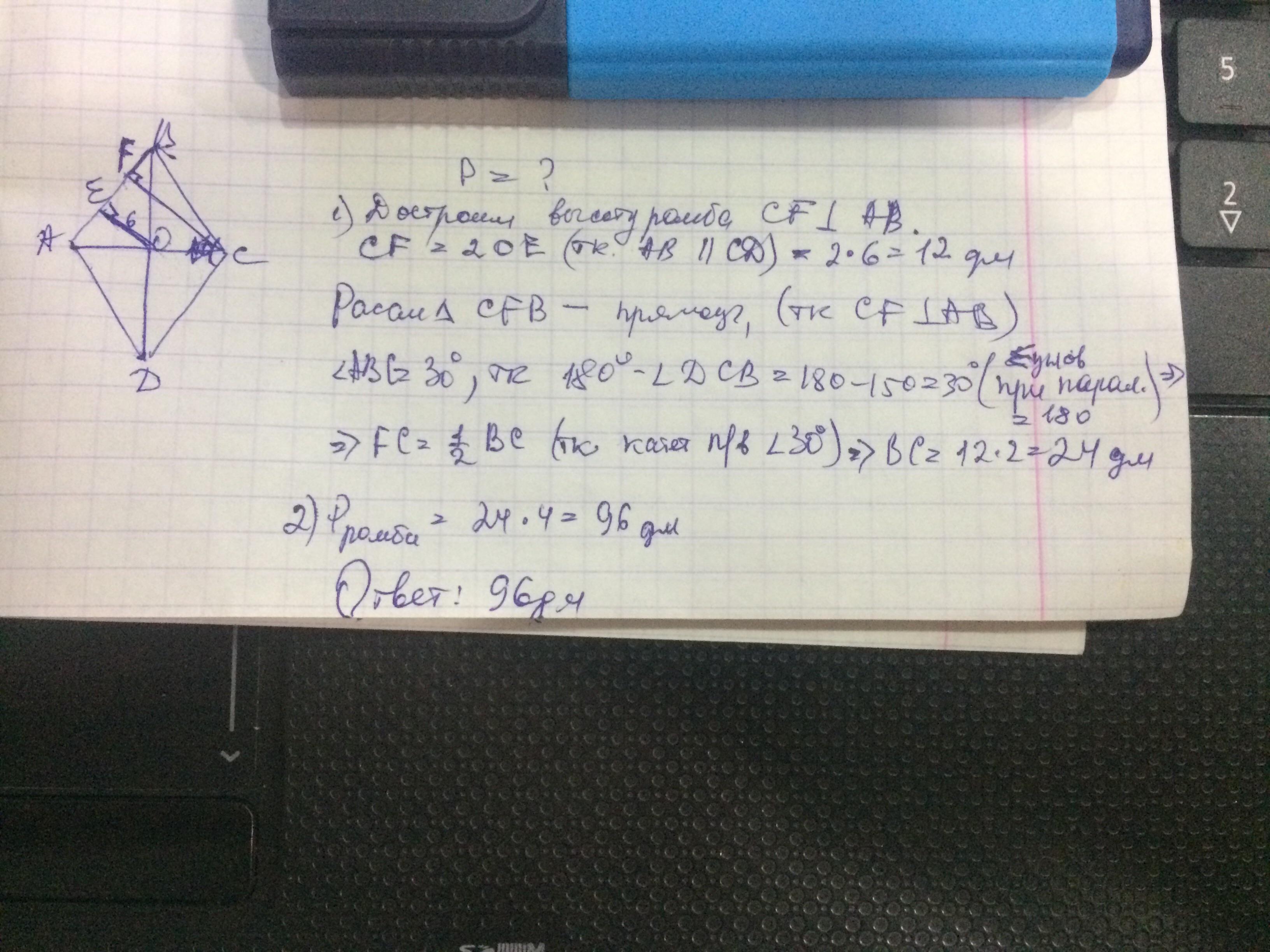 Дано: ромб. Угол 150. Расстояние от точки пересечения диагоналей до стороны =6дм. Найти периметр ромба.