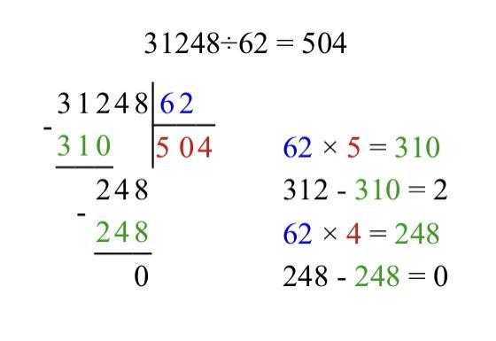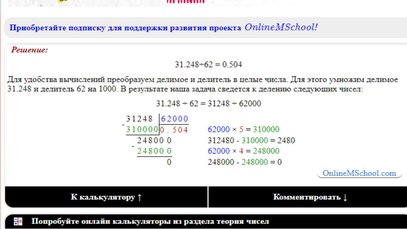 Для удобства вычислений преобразуем делимое и делитель в целые числа. Для этого умножим делимое 31.248 и делитель 62 на 1000. В результате наша задача сведется к делению следующих чисел:
