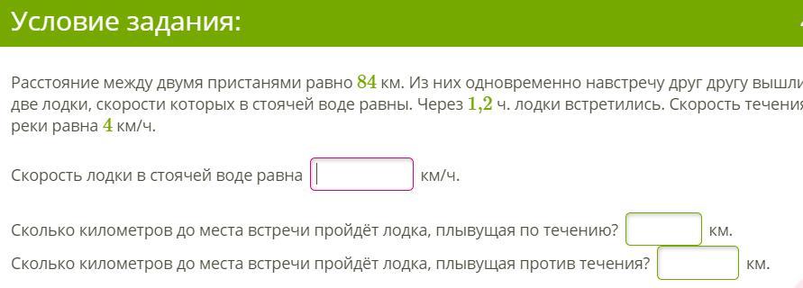 Расстояние между двумя пристанями равно 84 км. Из них одновременно навстречу друг другу вышли две лодки, скорости которых в стоячей воде равны. Через 1,2 ч. лодки встретились. Скорость течения реки равна 4 км/ч.