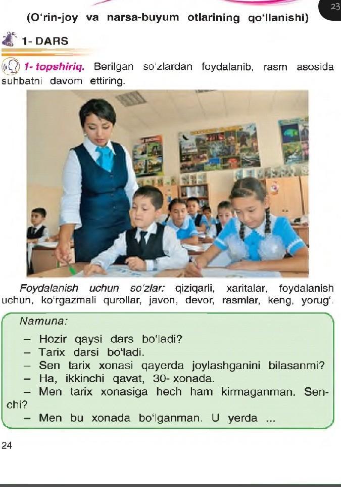 Ответ: -Men bu xonada bo'lganman. U yerda ko'rgazmali qurollar , foydalanish uchun xaritalar bor . Devorlarga qiziqarli rasmlar osib quyilgan . U yer juda keng va yorug' xona.