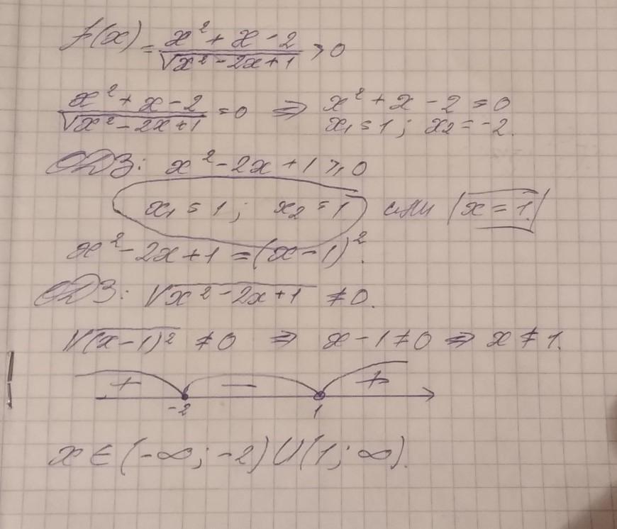 Дальше работаем со знаменателем. Значение под квадратным корнем должно быть больше либо равно нулю. Переписываем уравнение которое находится под корнем ≥ 0. решаем его как будто =0, находим корни отмечаем. Исключаем точки которые не входят в наше решение. Методом интервалов находим промежутки знакопостоянства, и отмечаем участки >0. Ответ готов.