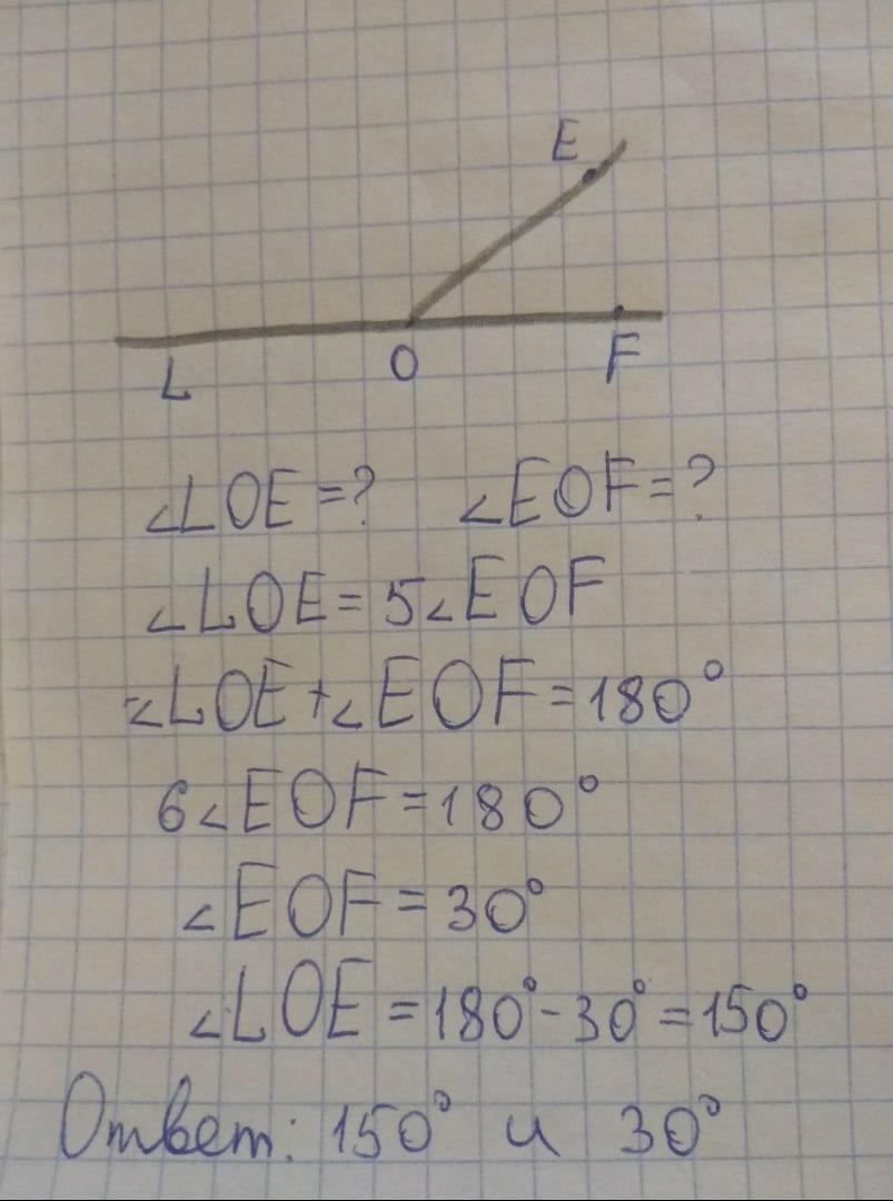 Пусть градусная мера одного угла будет х, тогда градусная мера второго угла будет 5х. Сумма смежных углов равна 180°. Составляем уравнение х+5х=180