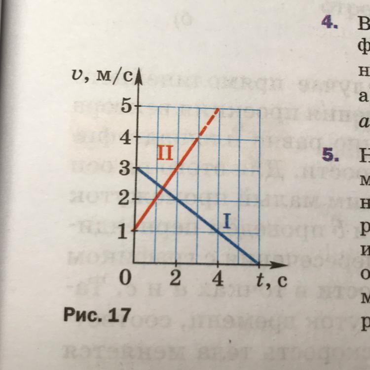 На рисунке 17 представлены графики зависимости модуля вектора скорости от времени при прямолинейном движении двух тел. С каким по модулю ускорением движется тело I; тело II? Запишите формулу изменения скорости для каждого тела. Постройте в одних и тех же координатных осях графики зависимости aх(t) (ось X считайте сонаправленной с вектором начальной скорости тела I)