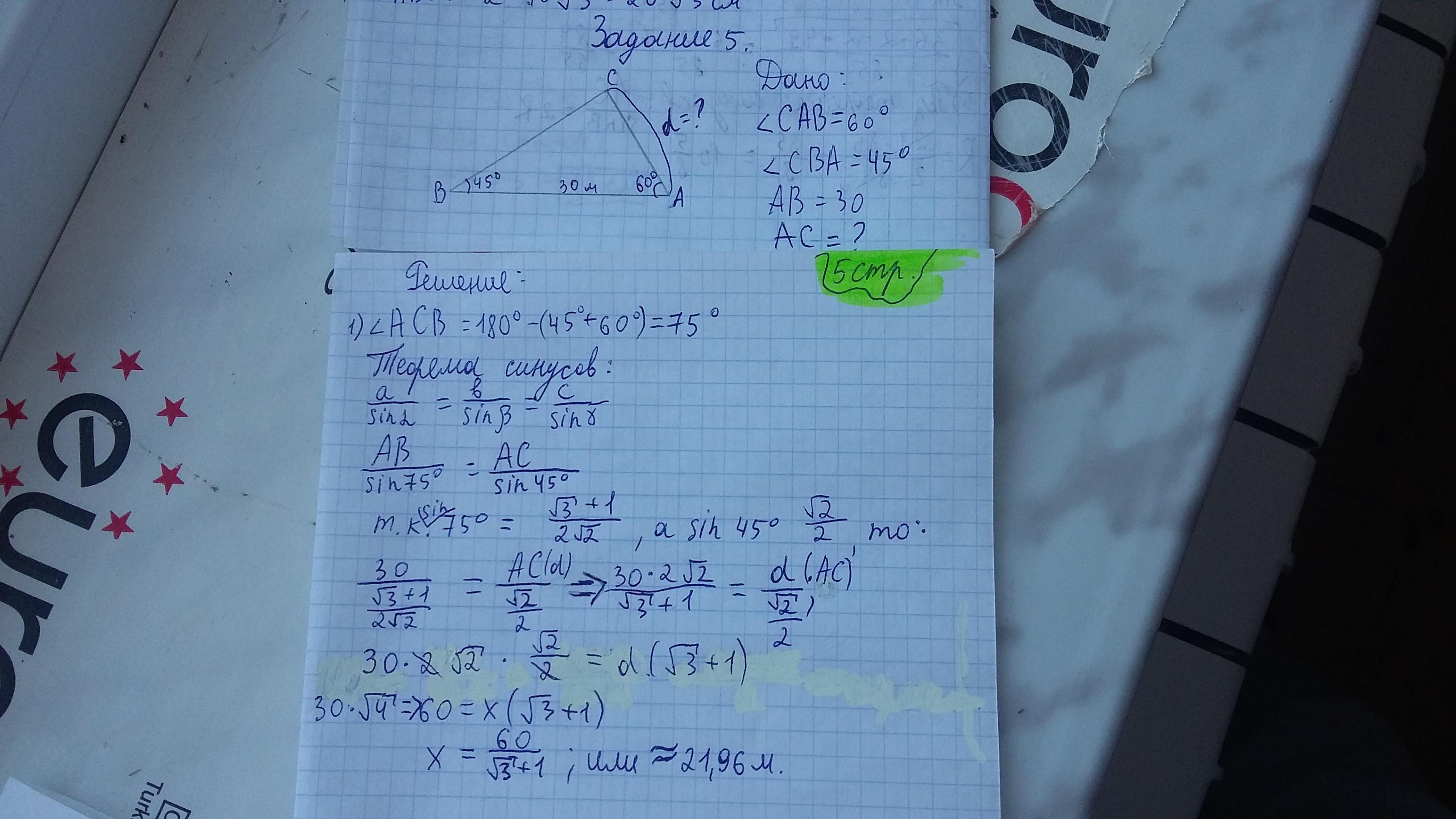 Угол С=180-(60+45); c/sinc = d/sinb; d=c*sin45/sin75
