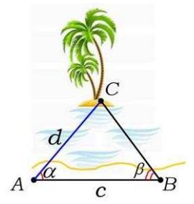 Чтобы найти расстояние d от пункта A до недоступного пункта C, на местности выбрали точку B и измерили длину c отрезка AB и углы α и β. Найдите расстояние от пункта A до пункта C, если AB=30 м, α=60°, β=45°