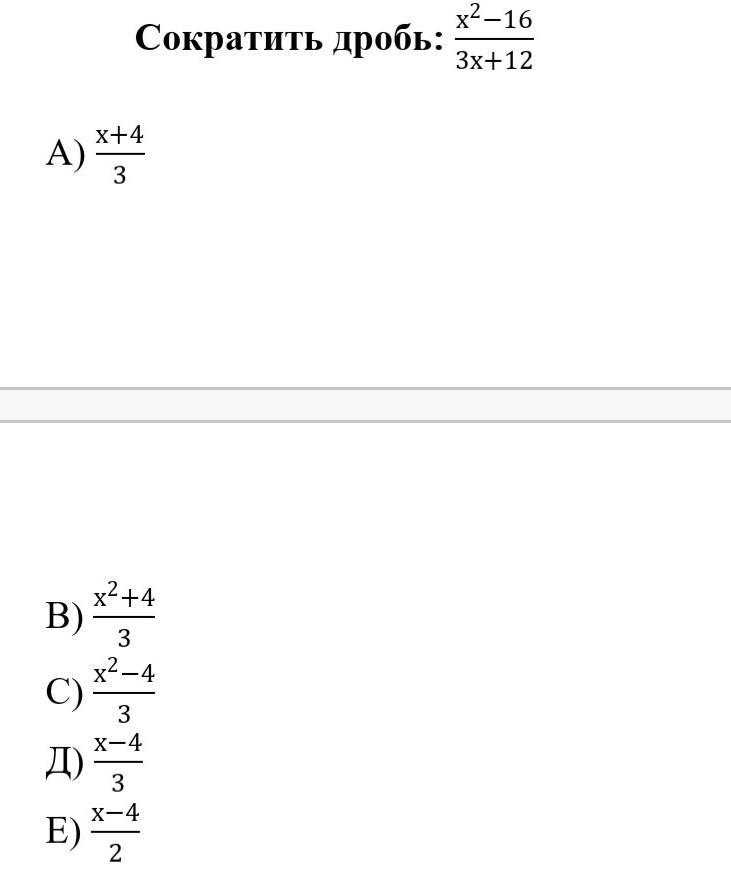 \frac{x^{2}-16 }{3x+12} =\frac{(x+4)(x-4)}{3(x+4)} =\frac{x-4}{3}