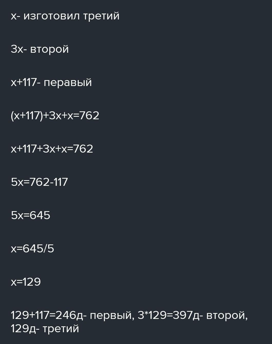 Трое рабочих изготовили 762 детали, причём второй изготовил в 3 раза больше деталей, чем третий, а первый на 117 деталей больше, чем третий. Сколько деталей изготовил каждый рабочий?