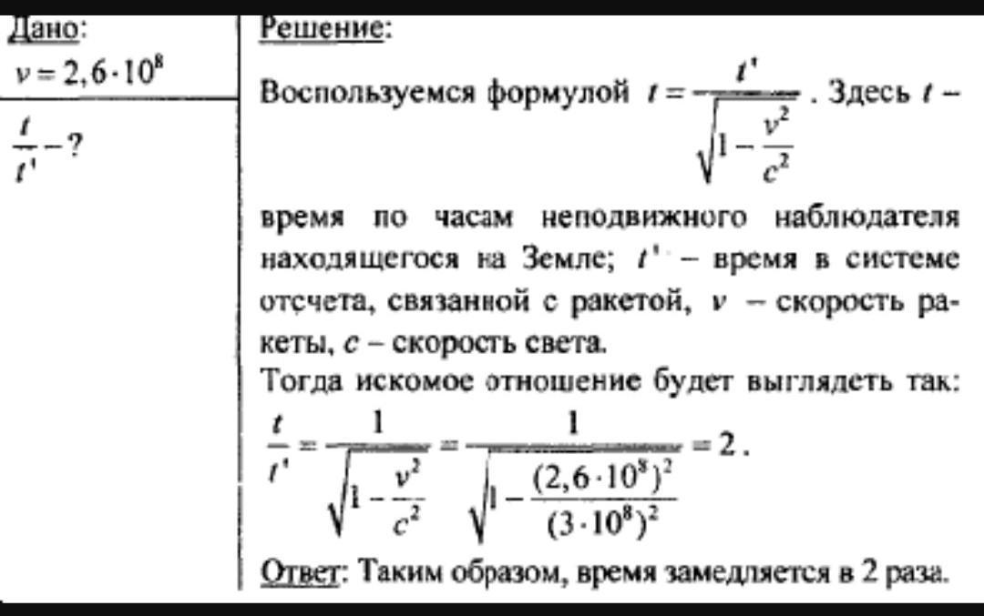Во сколько раз замедлится время в ракете, которая движется относительно Земли со скоростью 2,6 ∙ 108 м \ с?