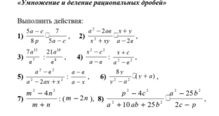 1)\frac{5a-c}{8p} *\frac{7}{5a-c}=\frac{7}{8p}\\\\2)\frac{a^{2}-2ab }{x^{2}+xy } *\frac{x+y}{a-2b} =\frac{a(a-2b)*(x+y)}{x(x+y)*(a-2b)}=\frac{a}{x}\\\\3)\frac{7a^{15}}{c^{7}}:\frac{21a^{16}}{c^{8}}=\frac{7a^{15}}{c^{7}}*\frac{c^{8} }{21a^{16} }=\frac{c}{3a} \\\\4)\frac{x^{2}-c^{2}}{a-c}:\frac{x+c}{a^{2}-c^{2}}=\frac{(x-c)(x+c)}{a-c}*\frac{(a-c)(a+c)}{x+c}=(x-c)(a+c)