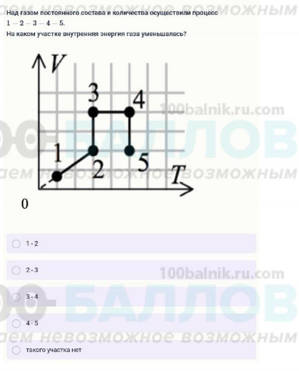 Над газом постоянного состава и количества осуществили процесс 1−2−3−4−5. На каком участке внутренняя энергия газа уменьшалась?