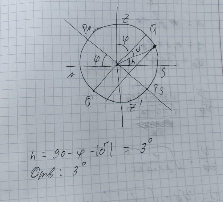 Географическая широта Лангепаса 61°. На какой высоте в этом городе происходит верхняя кульминация звезды Антарес, склонение которой равно –26°? Ответ дать в градусах.