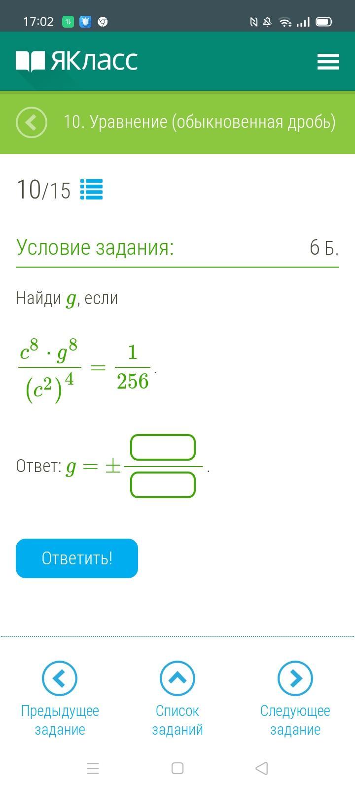 \frac{c^{8}*g^{8}}{(c^{2})^{4}} =\frac{1}{256} \\\\\frac{c^{8}g^{8}}{c^{8}} =\frac{1}{256} \\\\g^{8}=\frac{1}{256} \\\\g^{8}=(\frac{1}{2} )^{8}\\\\g=\frac{1}{2} \\\\g=-\frac{1}{2}