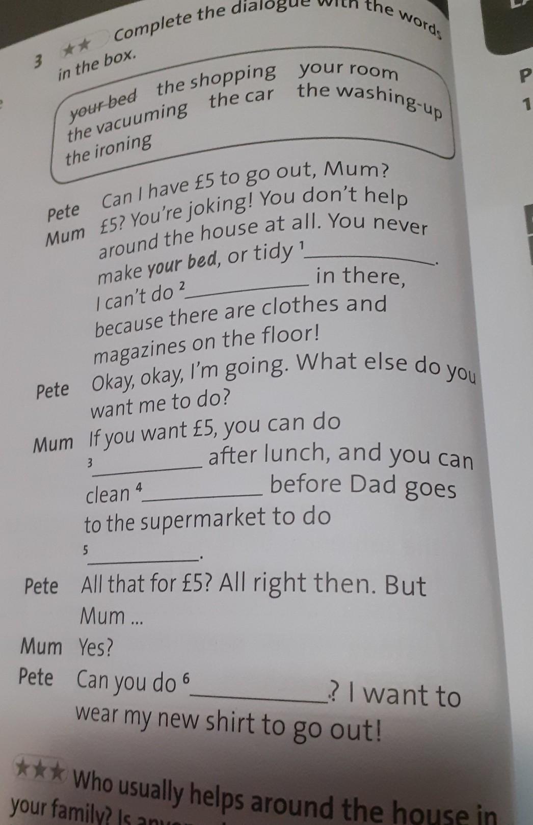 1. your room 2. the vaccuming 3. the ironing 4. the car 5. the shopping 6. the washing-up