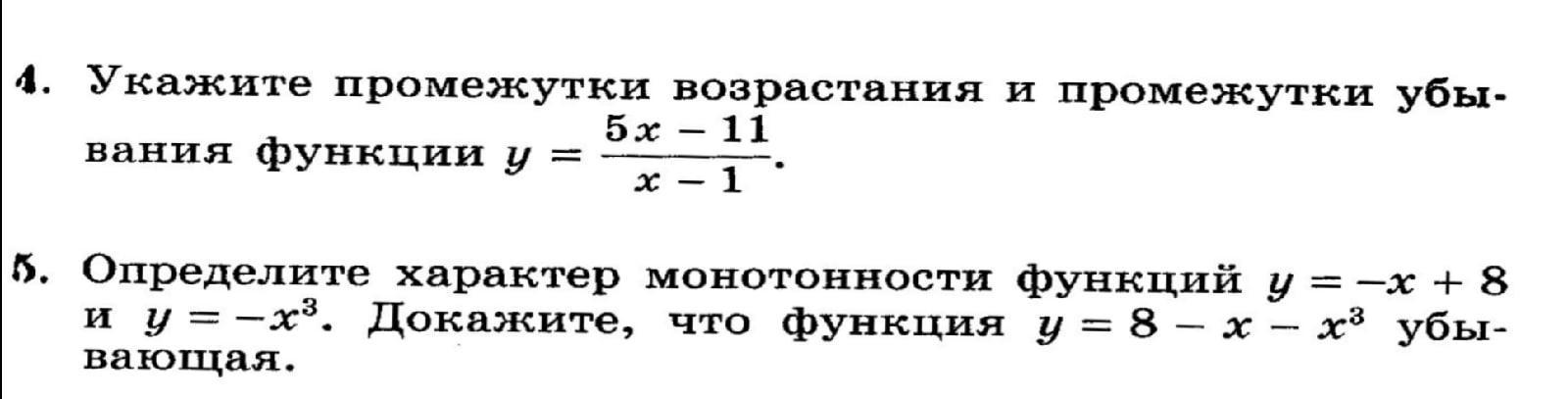 это 4 задание:Y=x⁶ y'=6x⁵ y'⁵<0 при x<0 убывает и возрастает при х>0. y= x⁹ y'=9x⁸ y'≥ 0 на всей оси, функция возрастает. y=|x-5| y=x-5 x≥5 возр. y=5-x x<5 убывает. y=|x+5| x≥-5 → y=x+5 возрастает x< -5 y=-x-5 убывает