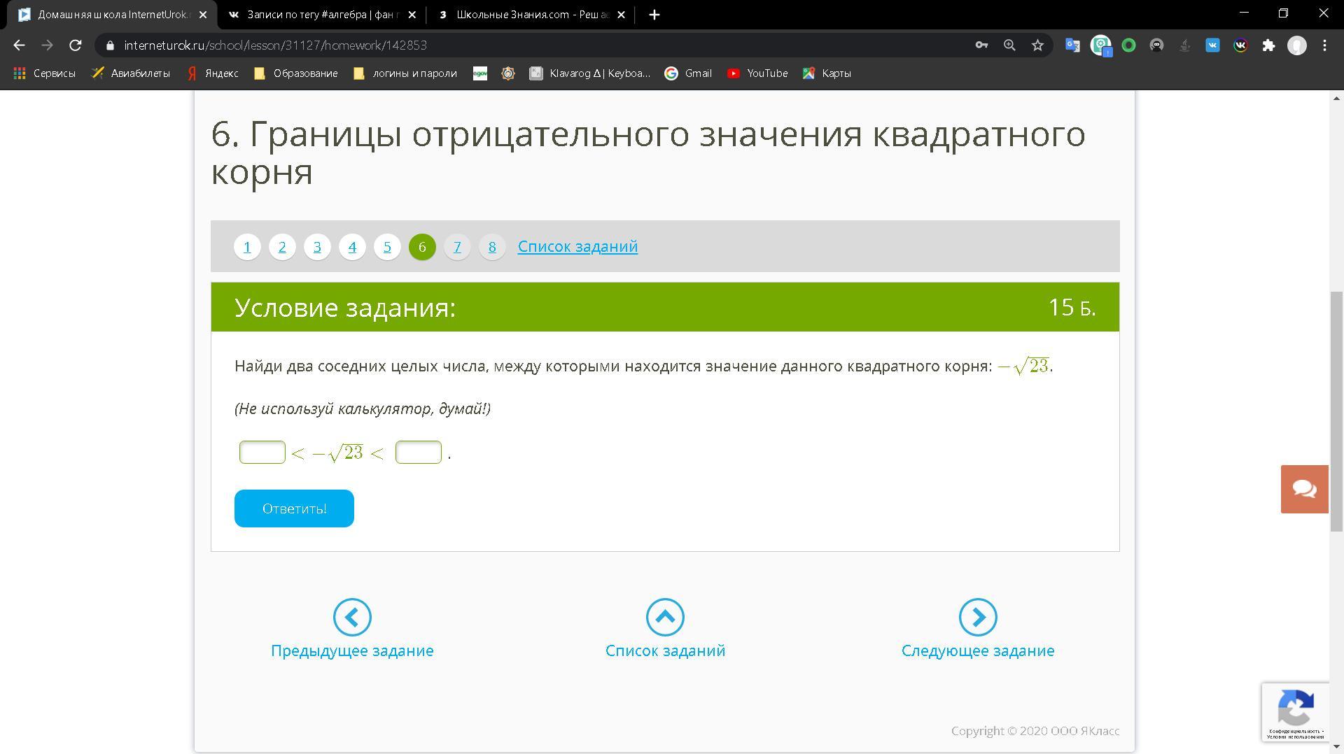 найди два соседних целых числа, между которыми находится значение данного квадратного корня