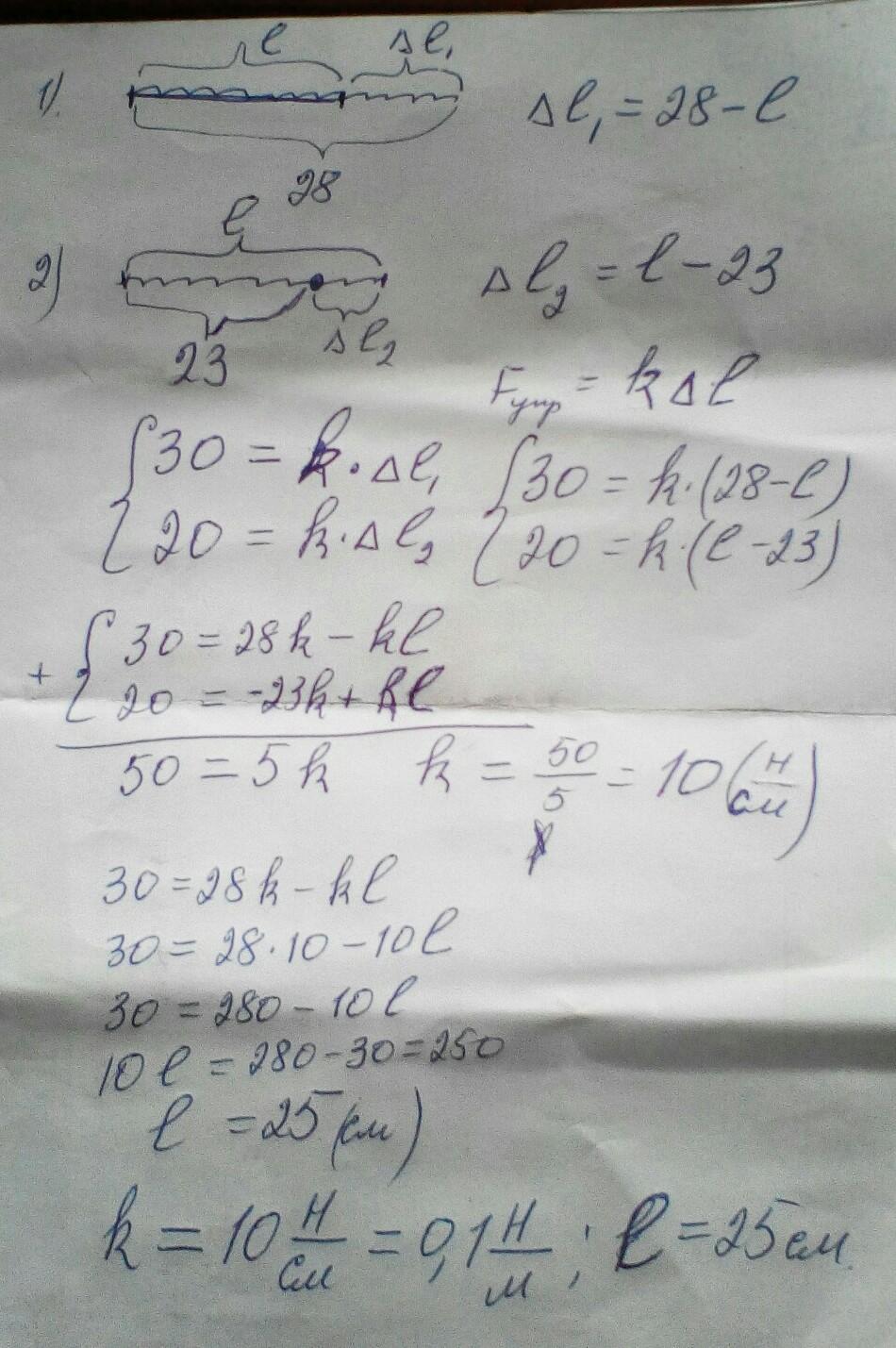 Якщо деяку пружину розтягувати силою 30 Н, то її довжина буде дорівнювати 28 см, а якщо стискати силою 20 Н то її довжина буде дорівнювати 23 см знайти довжину пружини у недеформовпному стані та коефіцієнт жорсткості?