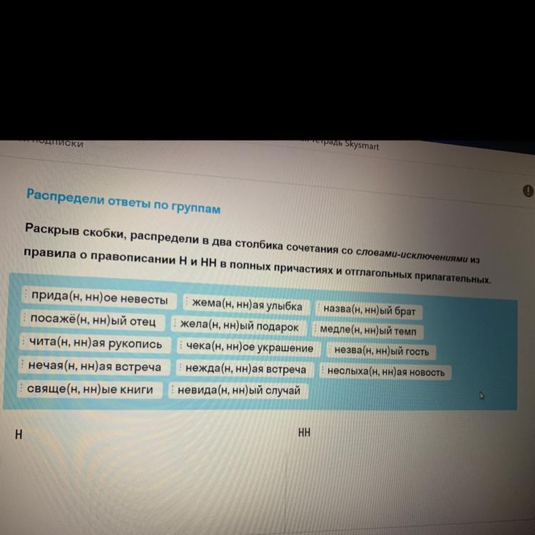 -НН- : нечаянная встреча, священные книги, жеманная улыбка, желанный подарок, чеканное украшение, нежданная встреча, невиданный случай, медленный темп, неслыханная новость.