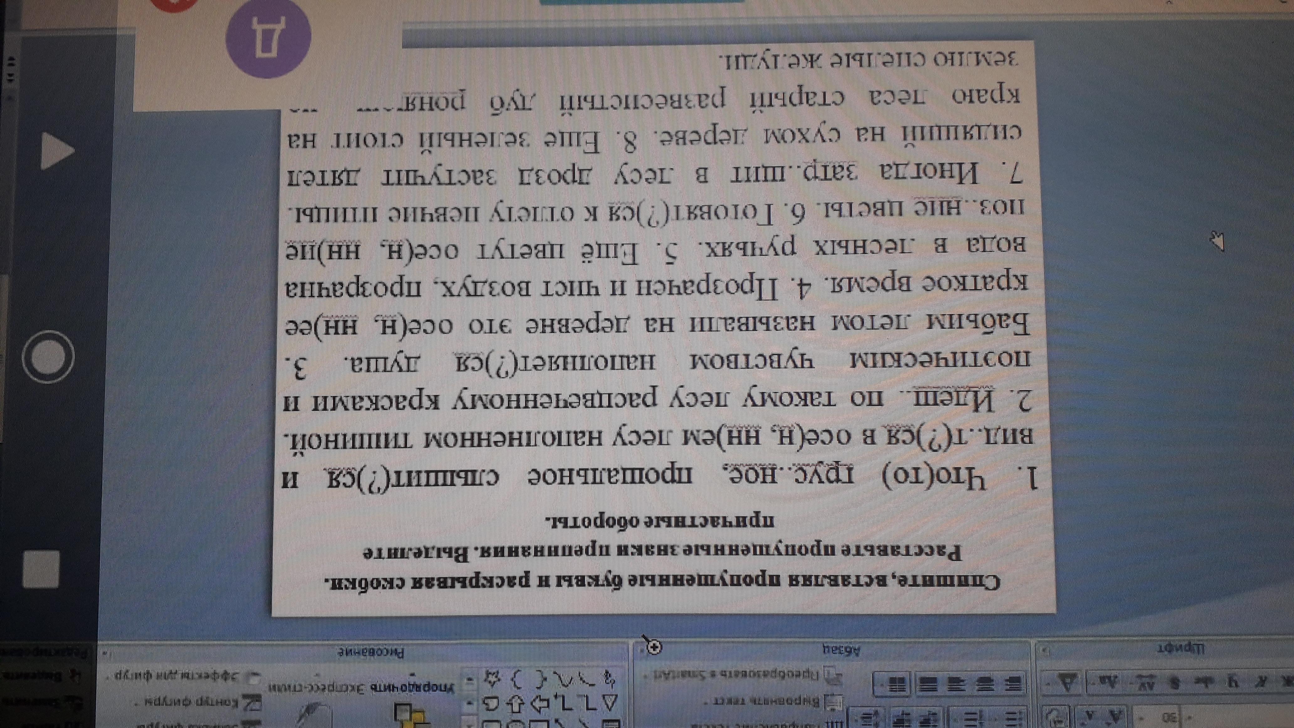 1. Что-то грустное, прощальное слышится и видится в осеннем лесу, наполненном тишиной. 2. Идешь по такому лесу, расцвеченному красками, и поэтическим чувством наполняется душа. 3. Бабьим летом называли на деревне это осеннее краткое время. 4. Прозрачен и чист воздух, прозрачна вода в лесных ручьях. 5. Ещё цветут осенние поздние цветы. 6. Готовятся к отлету певчие птицы. 7. Иногда затрещит в лесу дрозд, застучит дятел, сидящий на сухом дереве. 8. Ещё зеленый стоит на краю леса старый развесистый дуб, роняющий на землю спелые желуди .