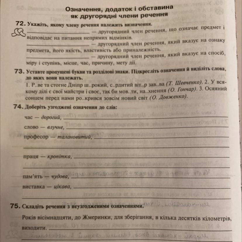 73 Реве та стогне Дніпр широкий(озн), сердитий(озн) вітер завива. У всякому(озн) ділі є свої майстри і своє, так би мовити, натхнення. Осяяний(озн) сонцем, перед нами розрісся зовсім новий(озн) світ.