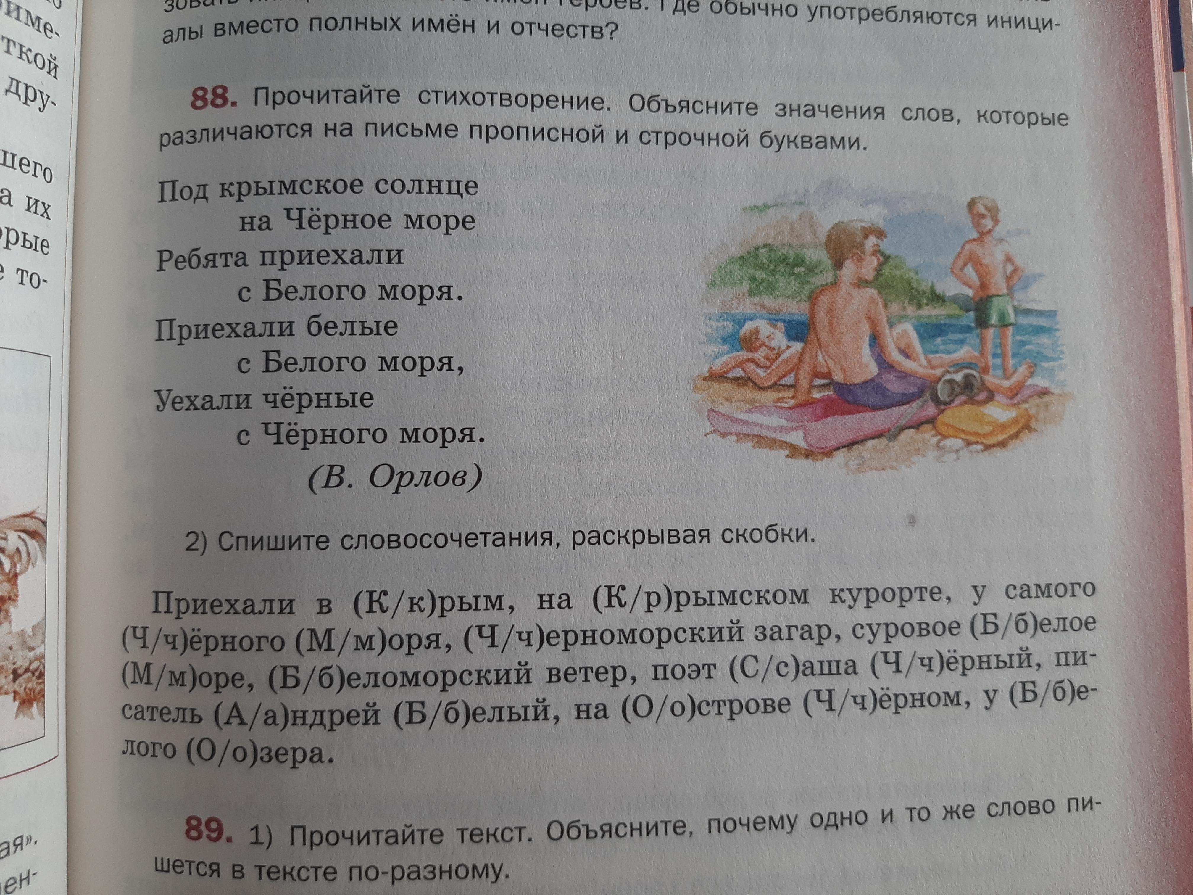1) приехал в Крым, на Крымском курорте, у самого Черного моря, черноморский загар, суровое Белое море, бедоморский ветер, поэт Саша Черный, писатель Андрей Белый, на острове Черном, у Белого озера.