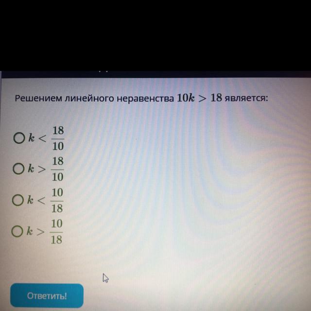 Решением линейного неравенства 10k > 18 является: