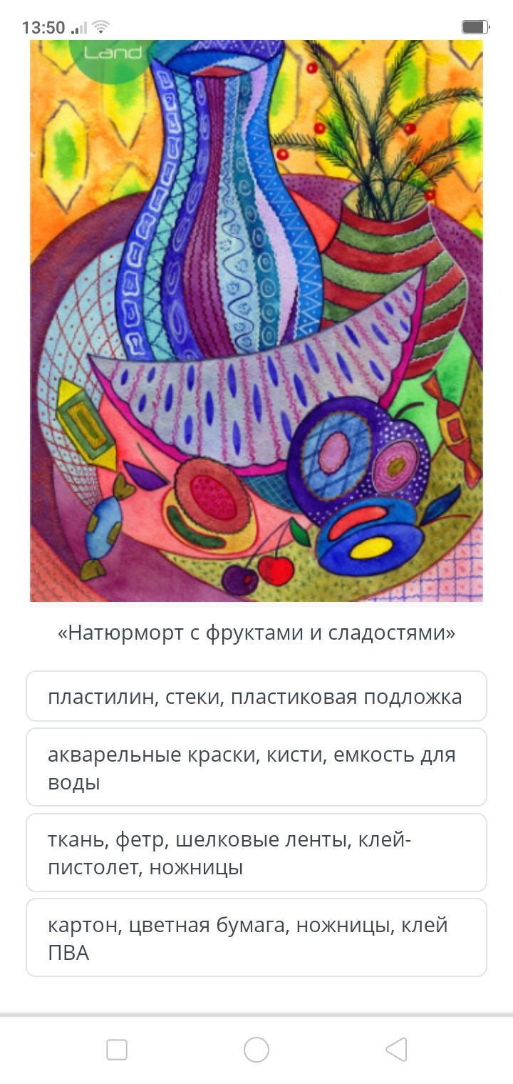 «Натюрморт с фруктами и сладостями» пластилин, стеки, пластиковая подложка акварельные краски, кисти, емкость для воды ткань, фетр, шелковые ленты, клей-пистолет, ножницы картон, цветная бумага, ножницы, клей ПВА помогите