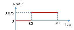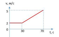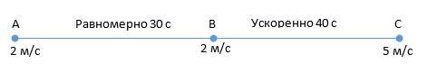 Автомобиль движется прямолинейно равномерно от пункта А до пункта В со скоростью 2 м / с в течение 30 с. Затем от пункта В до пункта С в течение 40 с с ускорением и его скорость в пункте С составляла 5 м / с. Определить ускорение и перемещение на каждом участке движения. Нарисовать графики а = f (t), v = f (t), s = f (t).