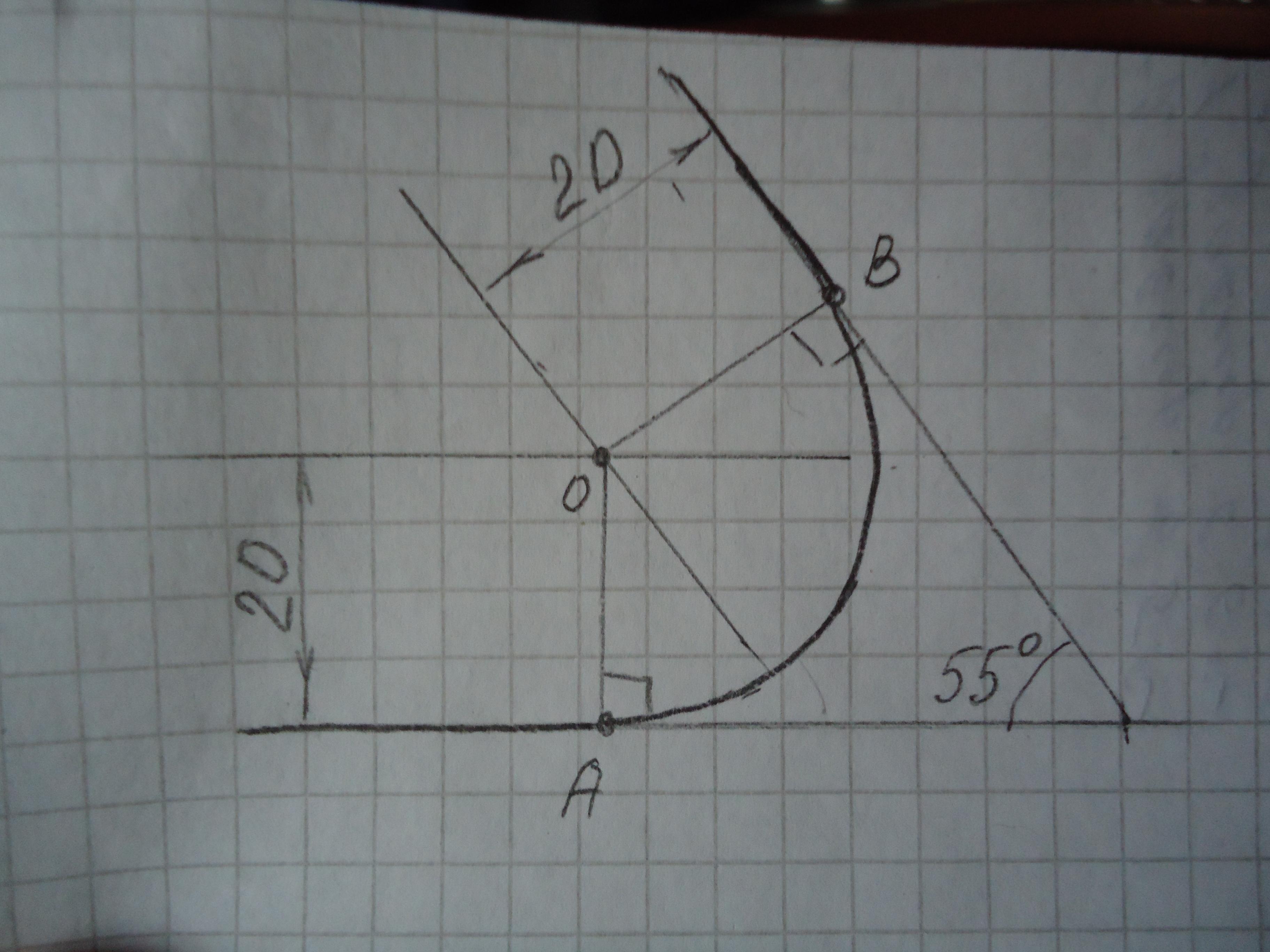 3)Из точки О проведите часть окружности от точки А до точки В.. Получили сопряжение сторон угла дугой 20 мм.
