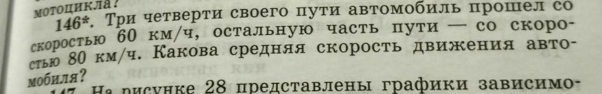 V сер=S/(0.75S/60 + 0.25S/80)=1/(3+0.75)/240=240/3.75=64км/ч- средняя скорость