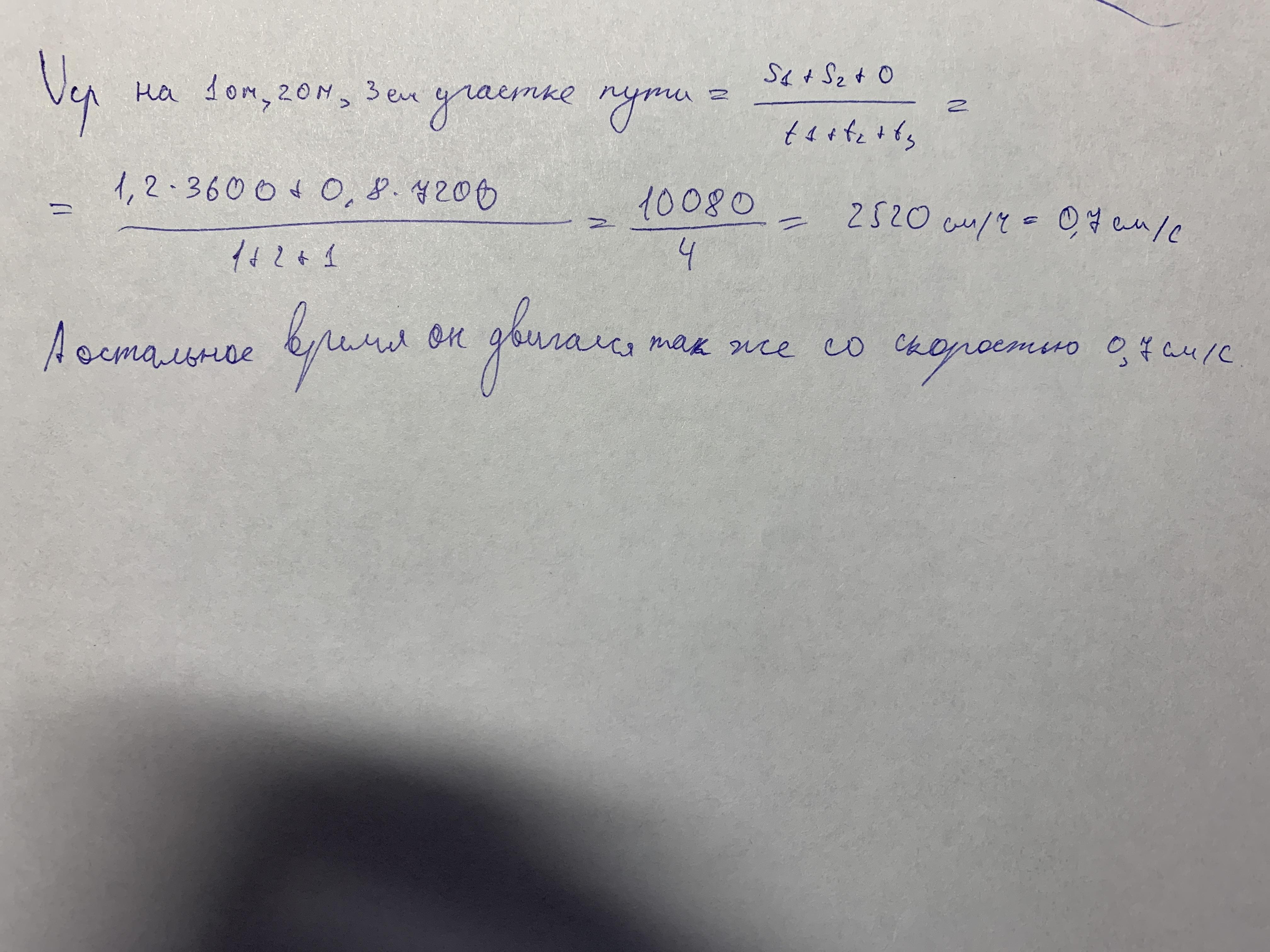 Улитка ползёт по прямой. Первый час её скорость постоянна и равна 1,2 см/с, еще два часа её скорость составляет 0,8 см/с, затем она ровно час отдыхала неподвижно. Остаток пути она ползла с постоянной скоростью 0,7 см/с.