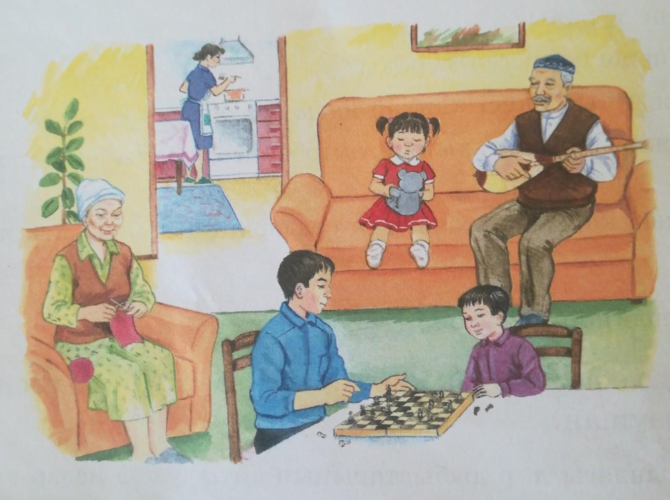 Біздің отбасымыз өте ұйымшыл отбасы. Біздің отбасымызда "Үлкенге құрмет,кішіге ізет "деген нақыл сөз қалыптасқан. Біздің отбасындағы әр адам мейірімді,бауырмал. Жексенбі күні барлығымыз үйде болып,бір-біріміздің жанымыздан табыламыз.Әркім өзінәң сүйікті ісімен айналысады. Әжетайым тоқыма тоқыса,атам газет оқиды. Анам тіл үйірер тәтті тағамдарын дайындайды. Әкем екеуіміз шахмат ойнаймыз. Ал қарындасым болса ойыншықтарымен ойнайды. Міне, біздің бақытқа толы бір күніміз.