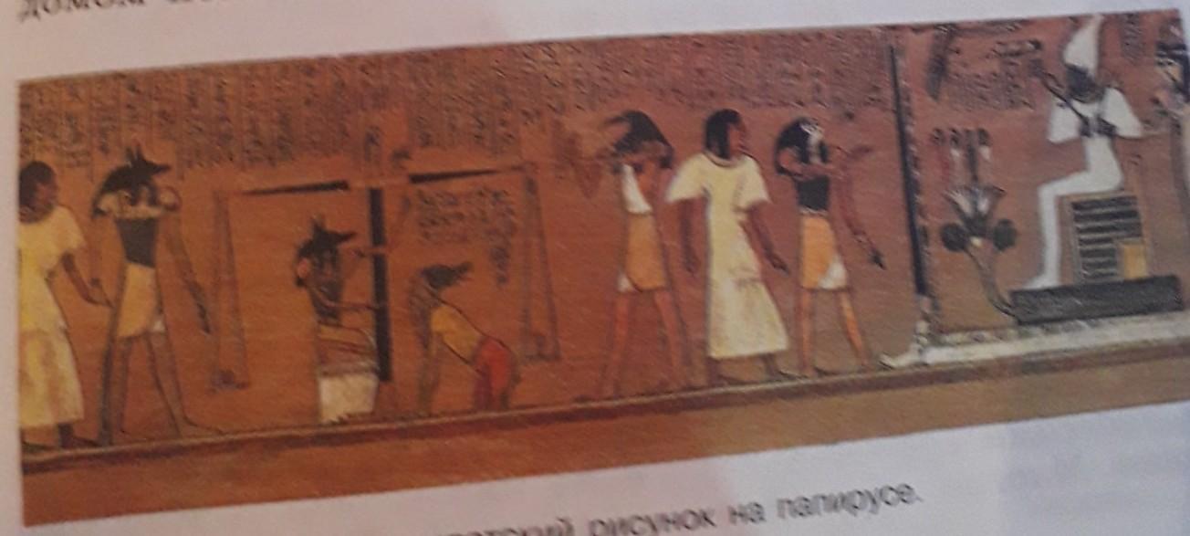 1.Бог с головой шакала - Анубис ведет умершего в белых одеждах в зал суда. Там уже приготовлены весы, на которых будет взвешено сердце человека и на одну чашу весов уже положено перо богини Маат. Под весами сидит зверь, готовый сожрать грешного.