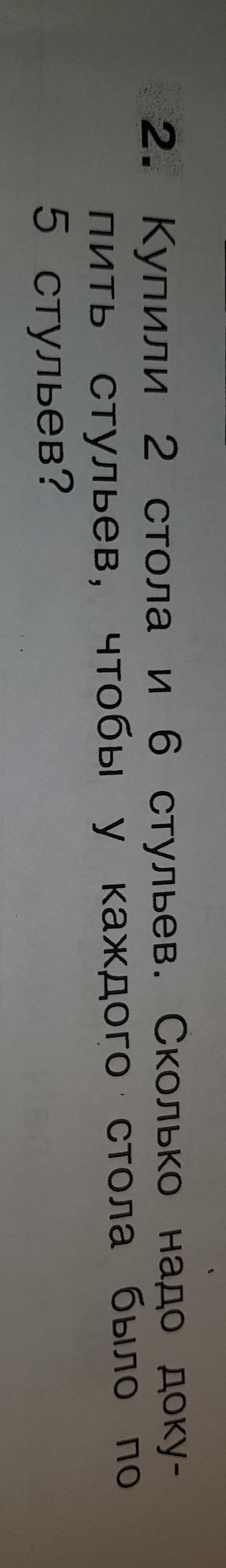Так как у нас 2 стола и 6 стульев ,если у каждого стола было по пять стульев, то можно предположить, что всего у нас на 1 стол уходит 5 стульев ,то 10 - 6 = 4 , четырех стульев не хватает.