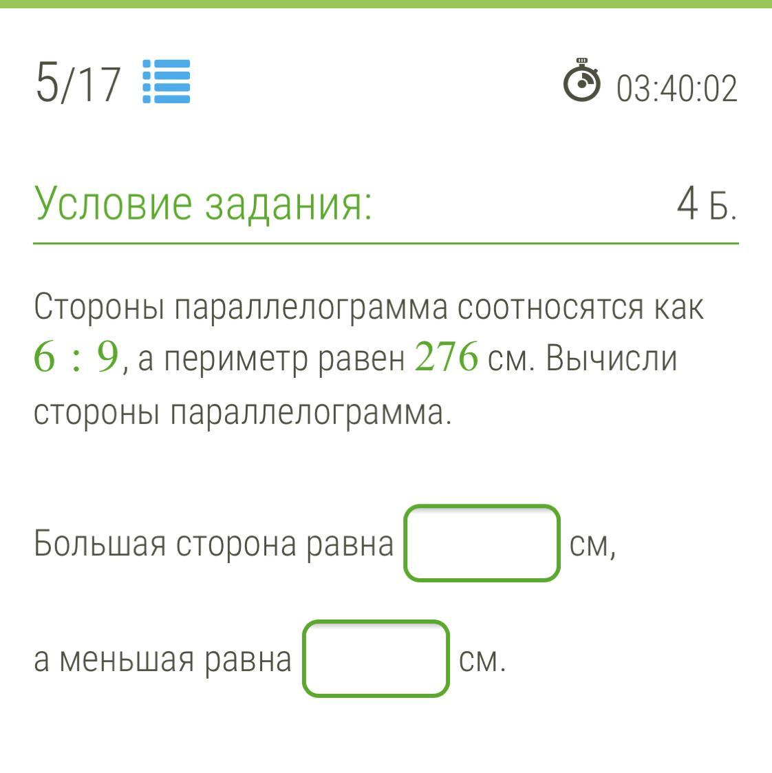 Стороны параллелограмма соотносятся как 6:9, а периметр равен 276 см. Вычисли стороны параллелограмма.
