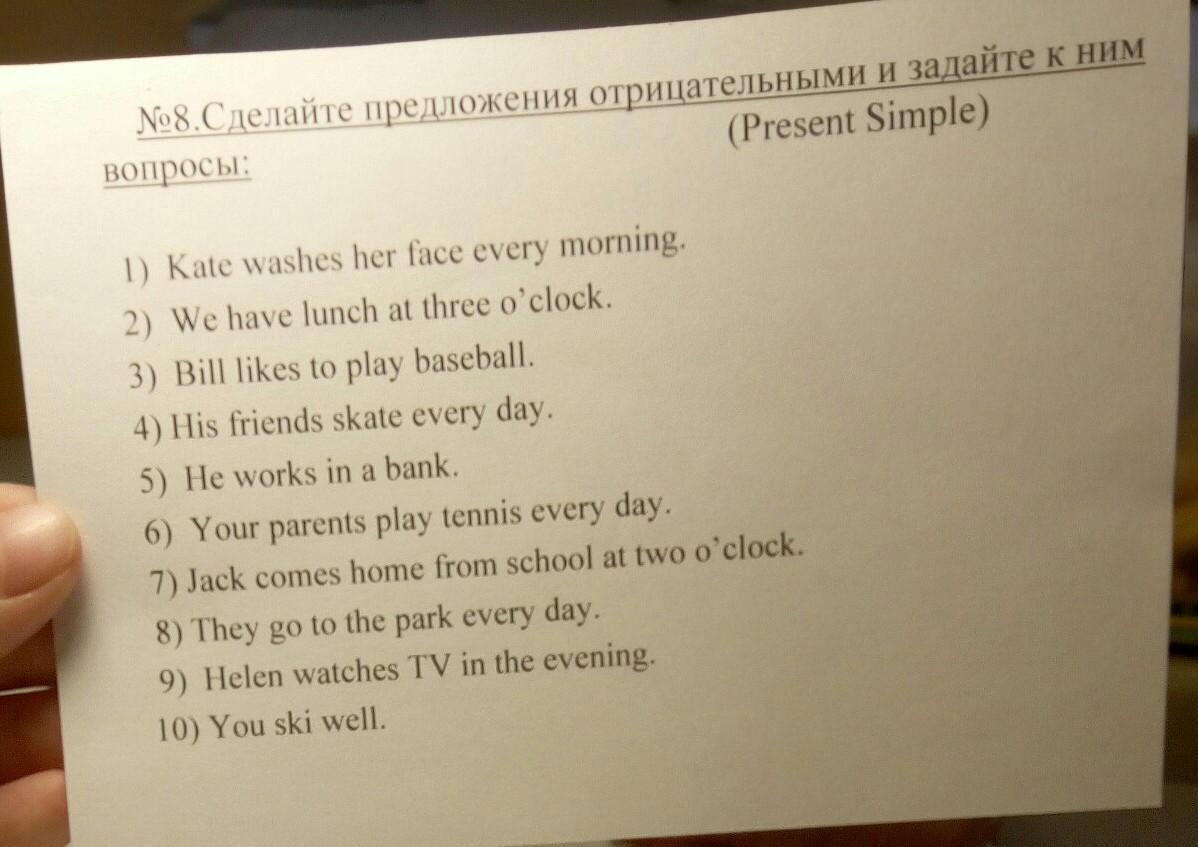 Ответ: 1. Kate doesn`t wash her face every morning, Does Kate washes her face every morning? 2. We didn`t have lunch at three o`clock, Did we have lunch at three o`clock? 3. Bill doesn`t likes to play baseball, Does Bill likes to play baseball?, 4. His friends doesn`t skate every day, Does his friends skate every day?, 5. He don`t works in a bank, Does he works in a bank?, 6. your parents doesn`t play tennis every day, Does your parents play tennis every day? 7. Jack doesn`t comes home from school at two o`clock, Does Jack comes home from school at two o`clock? 8. They don`t go to the park every day, Do they go to the park every day? 9. Helen doesn`t watches TV in the evening , Does Helen watches TV in the evening? 10. You don`t ski well, Do you ski well?