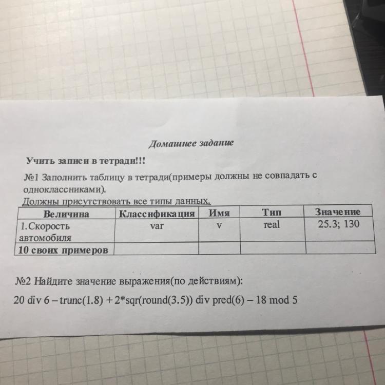 №1 Заполнить таблицу в тетради(примеры должны не совпадать с