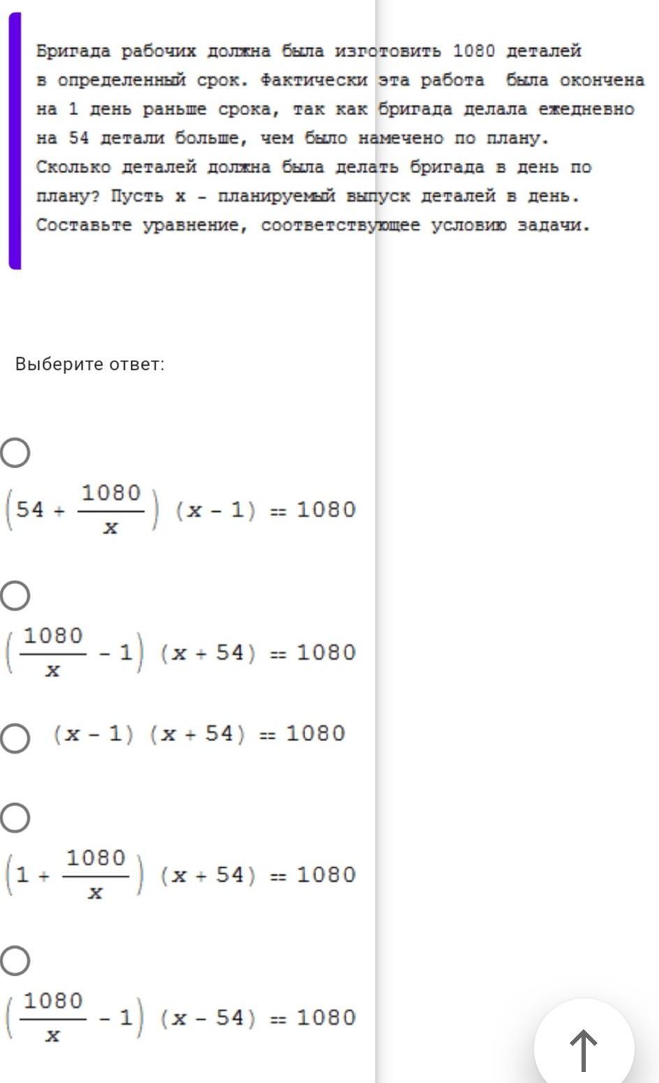 (1080/х-1) * (х+54) = 1080 (Второй ответ).