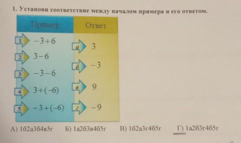 какое соответствие между началом примера и его ответом. (1. -3+6) (2. 3-6) (3. -3-6) (4. 3+(-6)) (5. -3+(-6).) (а. 3) (б. -3) (в. 9) (г. -9)