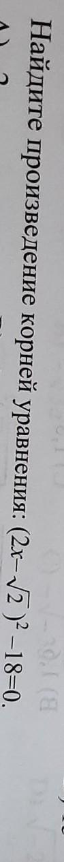 (2x-\sqrt{2})^2 - 18=0\\4x^2 - 4\sqrt{2}x+2-18=0\\4x^2 - 4\sqrt{2}x-16=0\\x^2 - \sqrt{2}x-4=0\\D=b^2-4ac=2+16=18\\x_{1}=\frac{\sqrt{2}+\sqrt{18}}{2}\\x_{2}=\frac{\sqrt{2}-\sqrt{18}}{2}\\\\x_{1}*x_{2}=\frac{2-18}{4}=-4