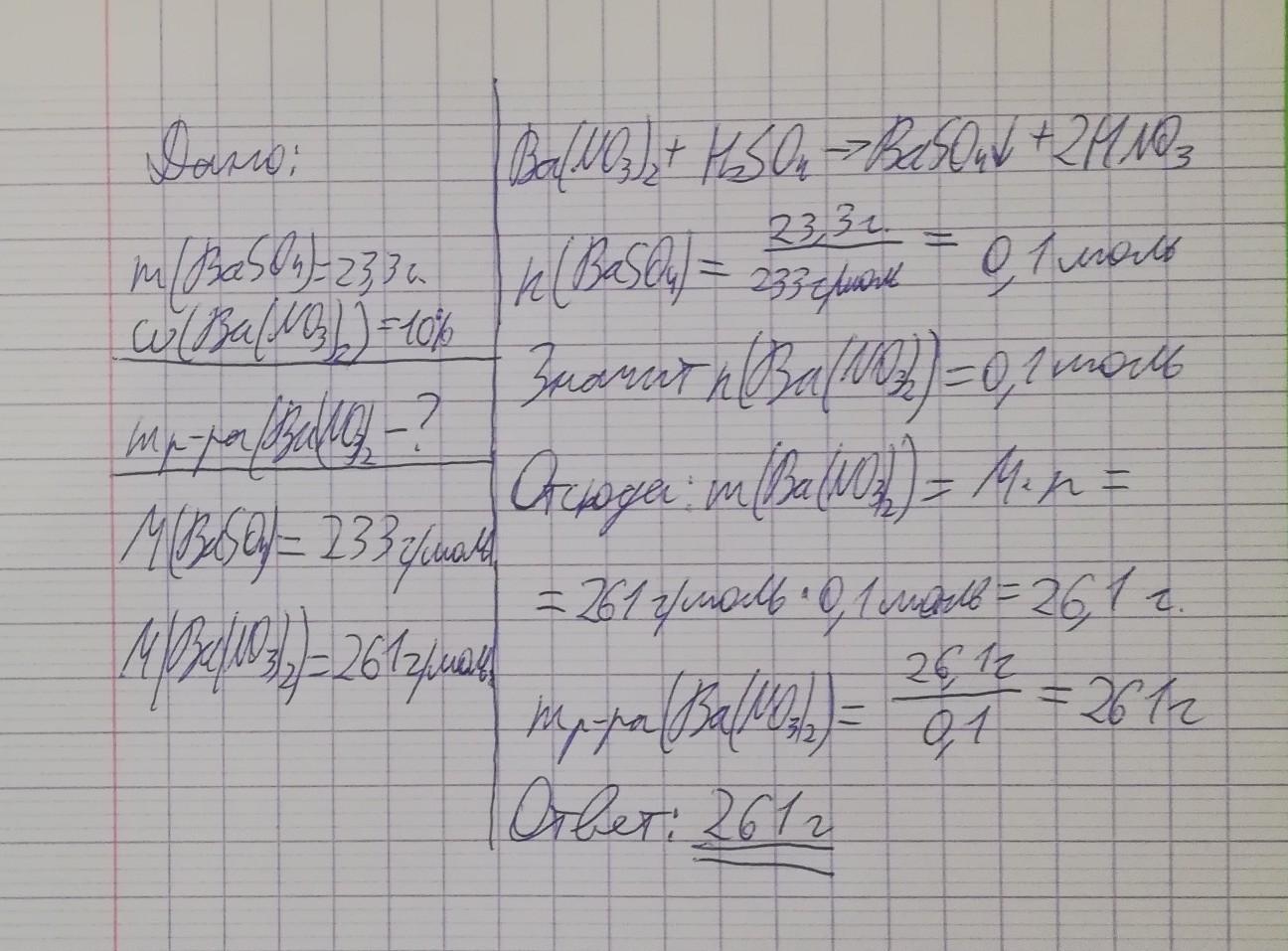 Вычислите массу раствора нитрата бария (массовая доля соли 10%) , которую необходимо добавить к раствору, содержащему серную кислоту, для того чтобы получить 23,3 г сульфата бария