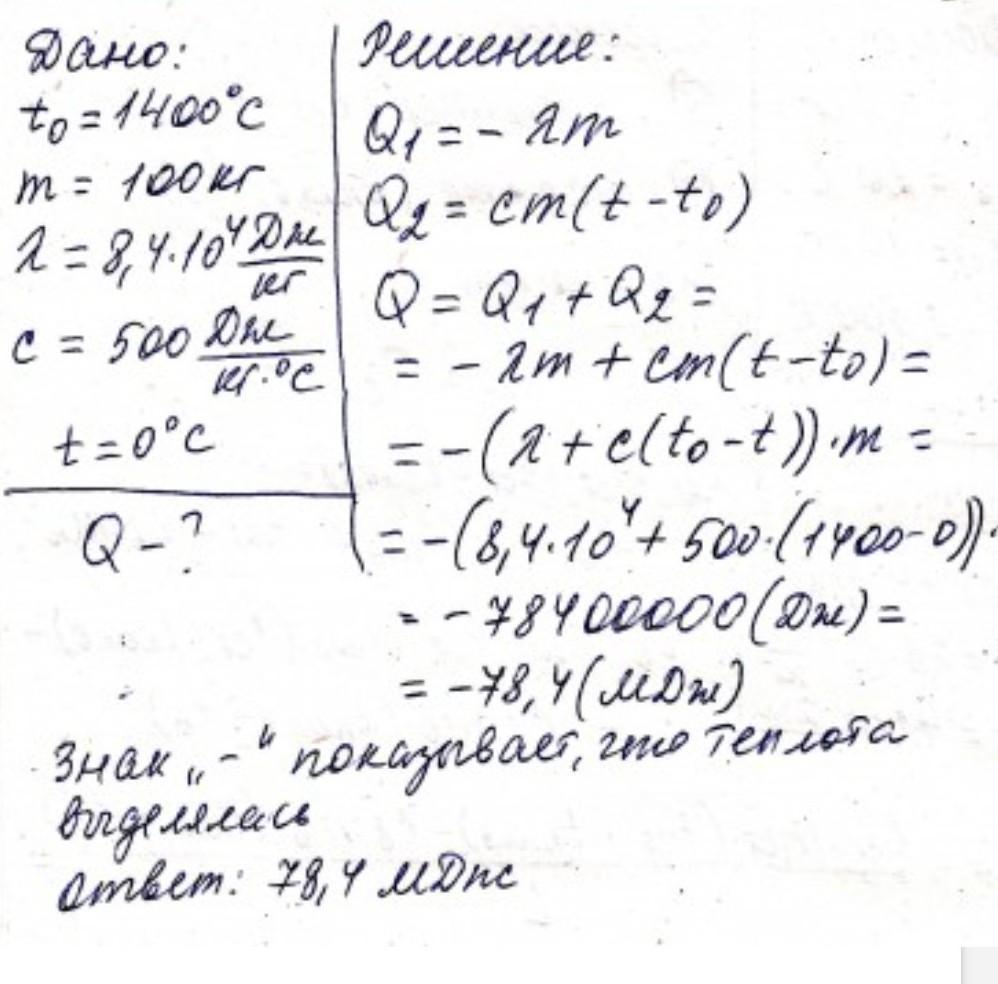 Яка кількість теплоти виділиться під час кристалізації 100 кг сталі та подальшого її охолодження до 0 градусів? Початкова температура сталі дорівнює 1400 градусів.