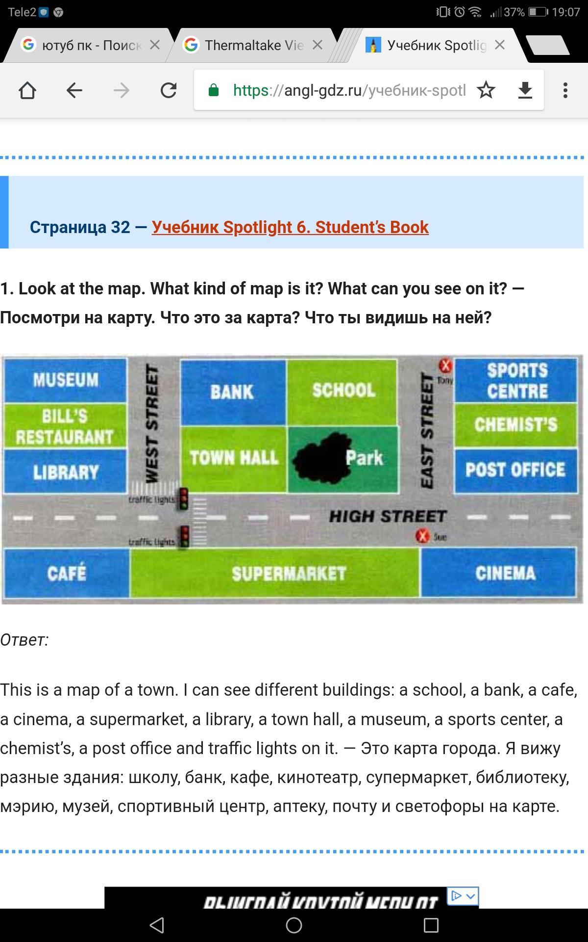 -Да,Я вижу как мне - Смотрите ,вам нужно пройти прямо по улице ,East до Cinema -Помню ! Я там проходил там справо находится Post Office и Chemist"s -Да,правильно . Дальше около Cinema находится огромный супермаркет -Хорошо куда далее? -Проходишь супермаркет и идёшь до начала кафе. -О,помню я сидел там со своими друзьями -Это классно! Далее идешь по West Street и справо будет музей -Спасибо огромное! Досвидания -Пока!