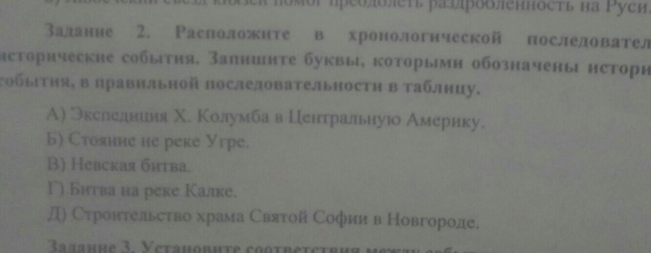 расположите в хронологической последовательности истортческих событий.Запишите буквы ,которыми обозначены исторические события, в правильной последовательности а)Экспедиция Х.Колумба в Центральную Америку б)стояние на реке Угре в)Невская битва г)Битва на реке Калке д)Строительство храма Святой Софии в Новогороде